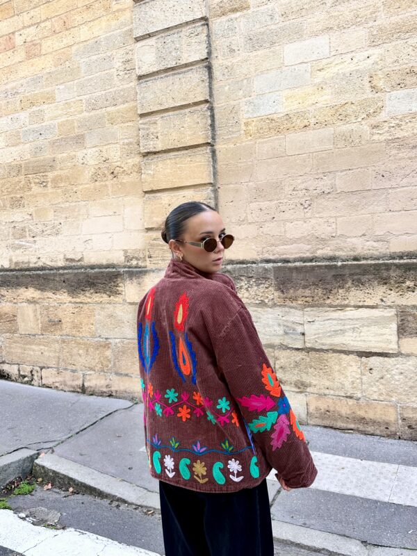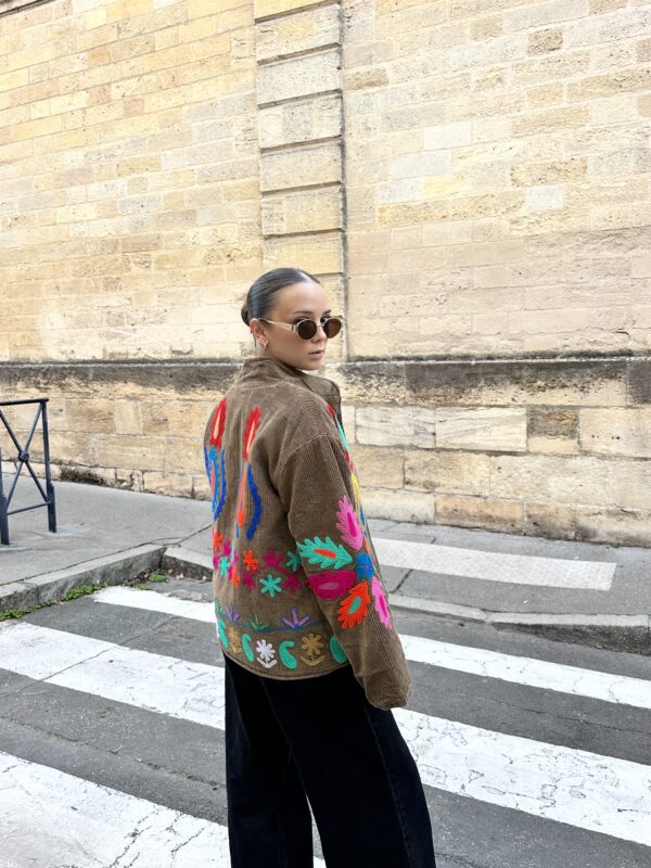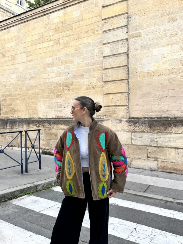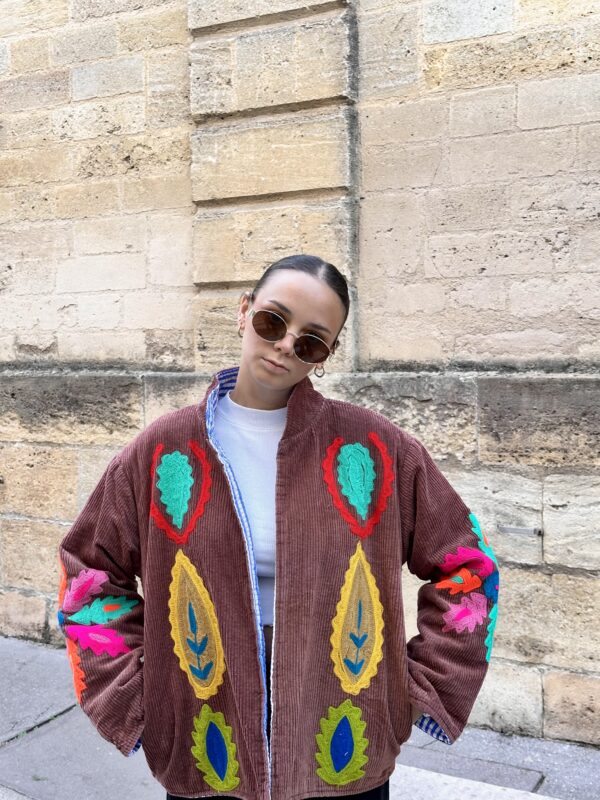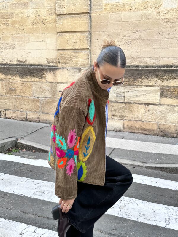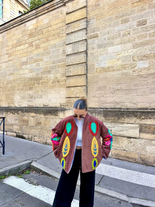 Brodée à la main sur un velours côtelé dense, Soléna allie texture et précision.